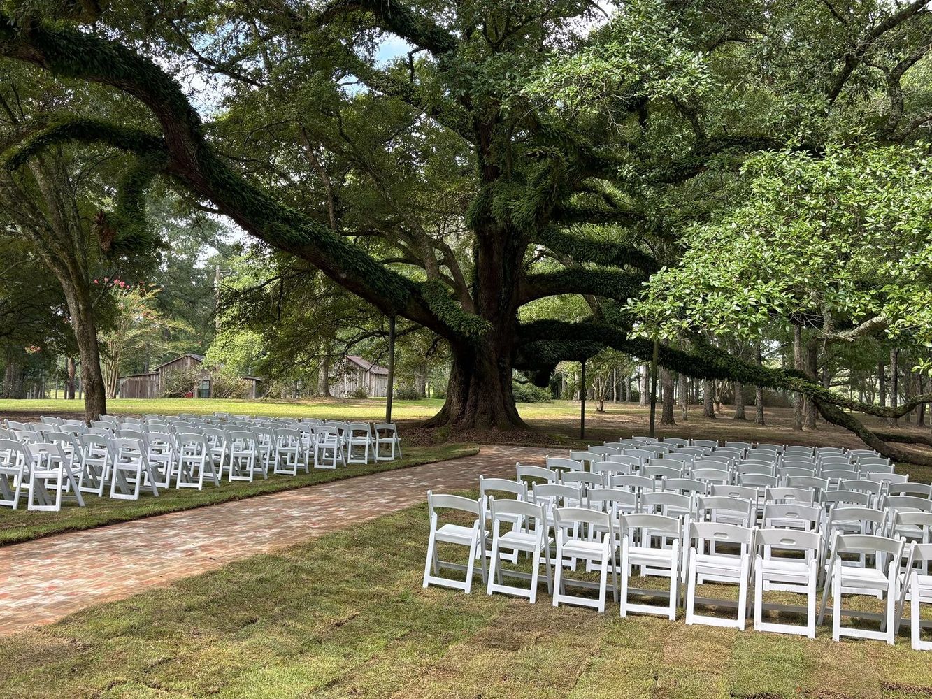 This Louisiana wedding venue features a beautiful bridal suite (Cabin 1) and a stylish groom’s suite (Cabin 2), along with a spacious open-air pavilion with flowing curtains—the perfect setting for getting ready and celebrating your big day. These luxury getting-ready spaces offer plenty of room for the wedding party to relax, prepare, and enjoy the moments before the ceremony. Oak Hill Farm, an elegant, Louisiana wedding venue, includes set up of tables, chairs in every package. We also provide a trusted Preferred Vendor List to help you choose your caterer and bar service, while still allowing you to bring your own vendors for any additional services. Be sure to browse our Oak Hill Farm wedding photos for inspiration as you plan your celebration.